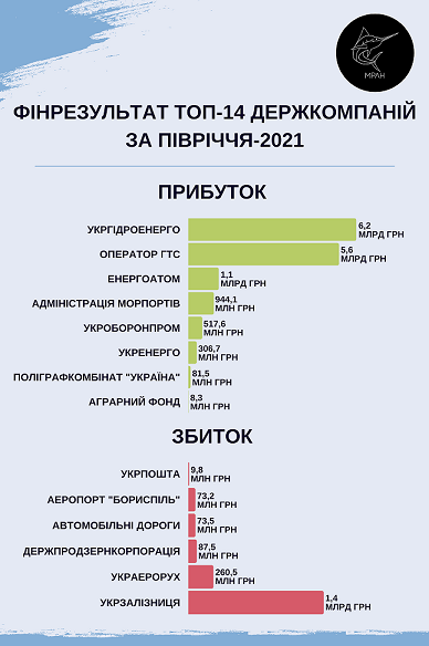 8 из 14 предприятий отчитались о прибыли на общую сумму 14,8 млрд грн. Наибольшие прибыли получили Укргидроэнерго на сумму 6,2 млрд грн; Оператор газотранспортной системы Украины – 5,6 млрд грн; Энергоатом – 1,1 млрд грн и Администрация морских портов - 944 млн грн.