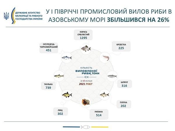 Так, за 6 месяцев украинские рыбаки выловили в Азовском море 1 113 тонн рыбы и других водных биоресурсов. За тот же период 2020 года этот показатель составлял 885 тонн.