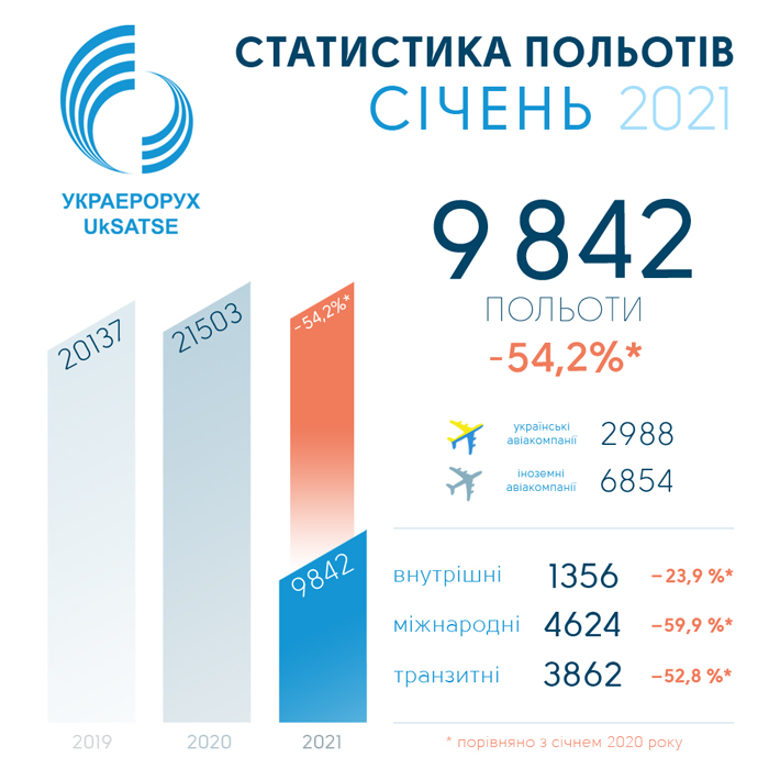 Государственное предприятие обслуживания воздушного движения Украины (Украэрорух) обеспечило аэронавигационным обслуживанием 9 842 рейса в январе 2021 года. Это на 54,2% меньше по сравнению с объемом полетов в январе прошлого года.