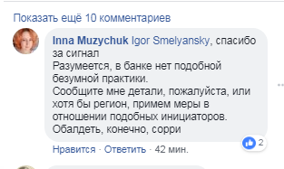 На сообщение Смелянского отреагировала представитель пресс-службы "Приватбанка" по связям с общественностью Инна Музычук, отметив, что в банке "нет подобной безумной практики".