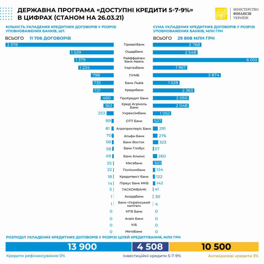 С момента старта Государственной программы «Доступные кредиты 5-7-9%» уполномоченные банки выдали 11 706 кредитов на общую сумму в 29 млрд грн.