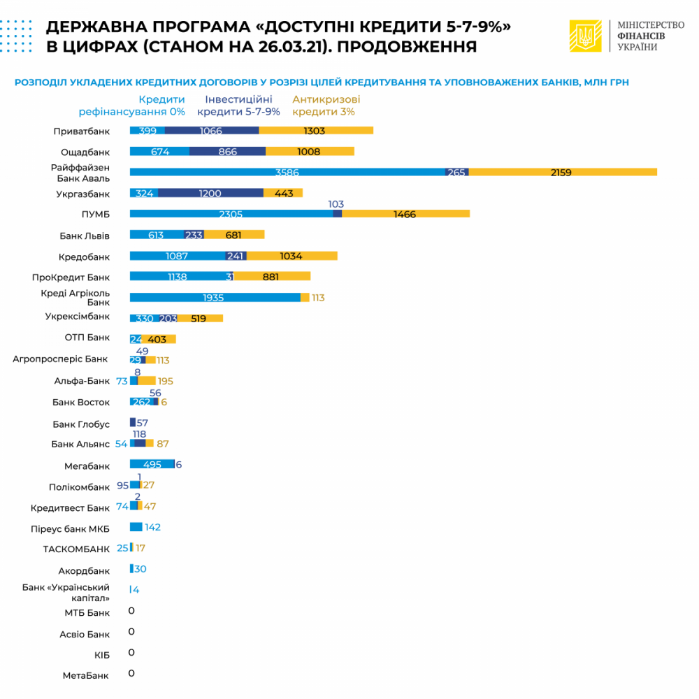 Как сообщает пресс-служба Министерства финансов Украины, из общей суммы 13,899 млрд грн были выданы в качестве рефинансирования предварительно полученных кредитов, 4,507 млрд грн предприниматели получили на инвестиционные цели и 10,5 млрд грн — в качестве антикризисных кредитов.