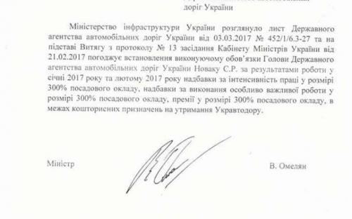 «Министерство инфраструктуры согласовывает установление и. о. председателя „Укравтодора“ по результатам работы в январе-феврале 2017 года надбавки за интенсивность труда в размере 300% должностного оклада, надбавки за выполнение особо важной работы в размере 300% должностного оклада, премии в размере 300% должностного оклада», — говорится в письме.