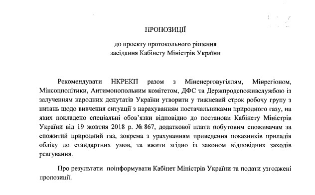 Правительство рекомендует НКРЭКУ вместе с Минэнерго, Минрегионом, Минсоцполитики, Антимонопольным комитетом и Фискальной службой в течение недели сформировать с участием нардепов рабочую группу для изучения ситуации с начислением облгазами, (на которых были возложены спецобязательства), дополнительных платежей за потребленный газ, в том числе с учетом приведения показателей счетчиков к стандартным условиям. Также рекомендуется применить в отношении облгазов меры.
