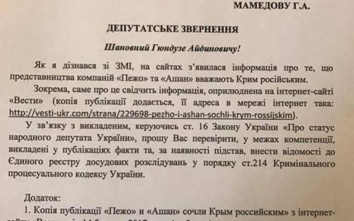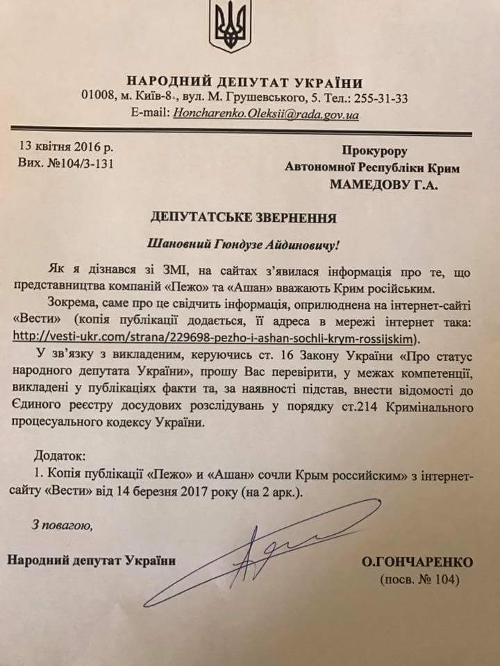 «В прокуратуру Автономной Республики Крым поступило обращение народного депутата Украины Гончаренко А. А. относительно проверки фактов, изложенных в одном из интернет-изданий, о размещении на официальных сайтах дилеров французских компаний, а именно Peugeot и «Ашан», информации об их представительствах на временно оккупированной территории полуострова Крым», - говорится в сообщении.