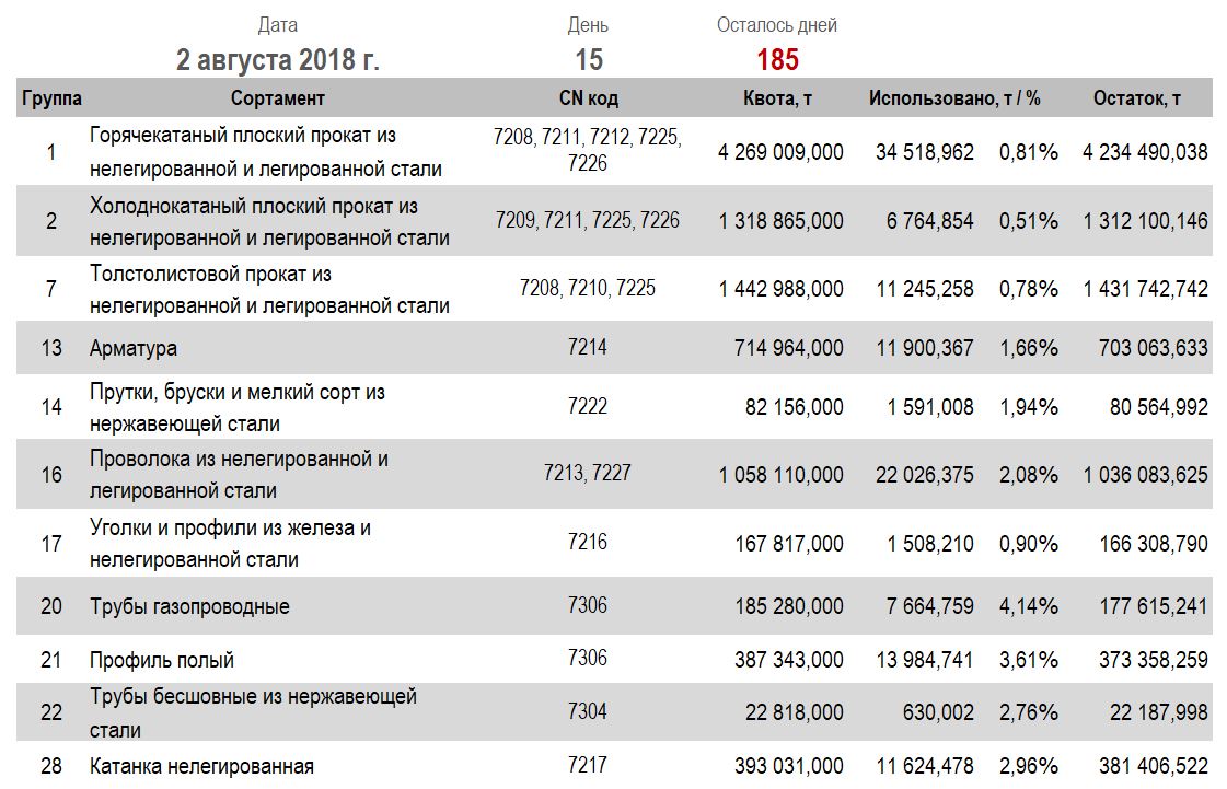 При этом уровень использования квоты, в частности, на горячекатаный плоский лист из нелегированной и легированной стали — 0,81% (34,519 тыс. тонн из 4,269 млн тонн), толстолистовой прокат — 0,78% (11,245 тыс. тонн из 1,443 млн тонн), арматуру — 1,66% (11,9 тыс. тонн из 714,964 тыс. тонн), уголки и профили — 0,9% (1,508 тыс. тонн из 167,817 тыс. тонн), бесшовные трубы из нержавеющей стали — 2,76% (630 тонн из 22,818 тыс. тонн), катанку — 2,96% (11,624 тыс. тонн из 393,031 тыс. тонн).