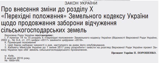 Кабинету министров поручено до 1 июля 2017 года разработать и внести на рассмотрение Верховной Рады проект закона об обороте земель сельскохозяйственного назначения.