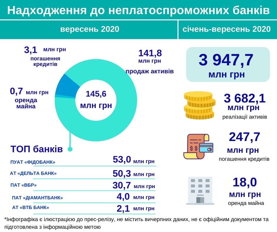 Всего за январь-сентябрь 2020 года сумма средств, которые поступили на счета неплатежеспособных банков, составила 3,95 млрд грн. В частности, от реализации активов сумма поступлений составила 3,68 млрд грн. Кроме того, за счет погашения кредитов неплатежеспособные банки в этот период получили 247,7 млн грн, аренды имущества - 18,0 млн грн. От погашения ценных бумаг в январе-сентябре 2020 года средства не поступали.