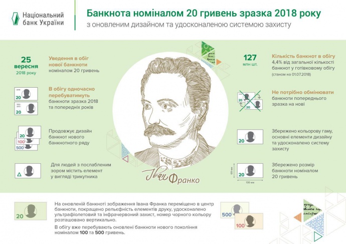 Как говорится в сообщении НБУ, новая банкнота номиналом 20 гривен будет введена в обращение 25 сентября 2018. Новыми банкнотами Национальный банк будет замещать изношенные и поврежденные 20-гривневые банкноты образца 2003 года.