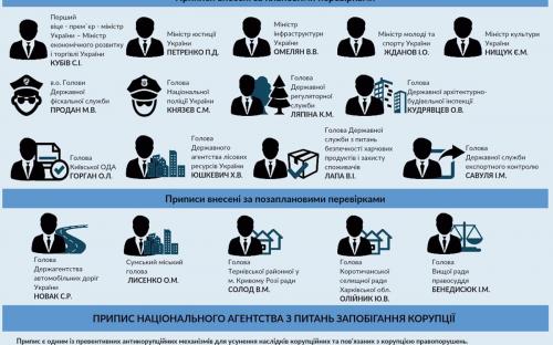 Отмечается, что предписания были вынесены по результатам проведенных плановых и внеплановых проверок органов государственной власти и местного самоуправления по организации работы по предупреждению и выявлению коррупции. Предписания внесены первому вице-премьер-министру Украины - министру экономического развития и торговли Степану Кубиву, министру юстиции Павлу Петренко, министру инфраструктуры Владимиру Омеляну, министру молодежи и спорта Игорю Жданову, министру культуры Евгению Нищуку, а также главам 9 других центральных органов исполнительной власти и руководителям 4 органов местного самоуправления.