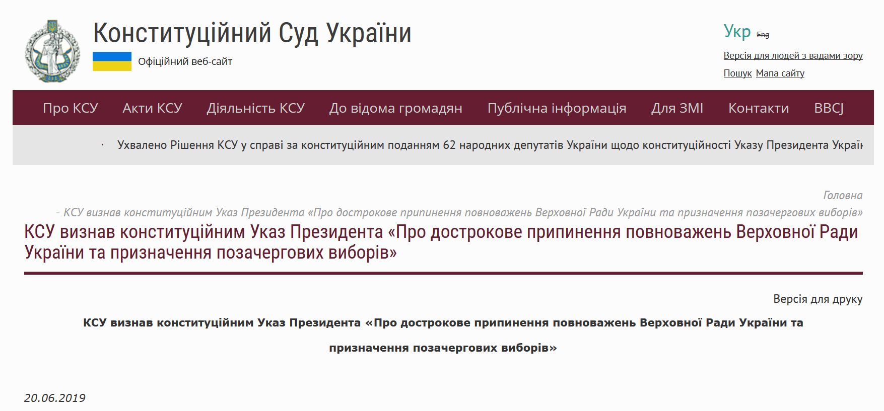"Этим решением Конституционный Суд Украины признал соответствующим Конституции Украины (конституционным) Указ Президента Украины «О досрочном прекращении полномочий Верховной Рады Украины и назначении внеочередных выборов», - говорится в решении.