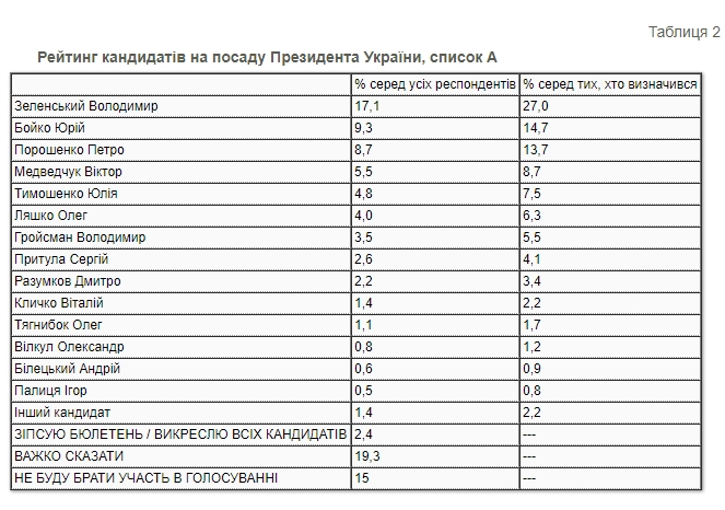 Второе-третье места делят Юрий Бойко (14,7%) и Петр Порошенко (13,7%). Далее идут Виктор Медведчук (8,7%), Юлия Тимошенко (7,5%), Олег Ляшко (6,3%), Владимир Гройсман (5,5%), Сергей Притула (4,1%), Дмитрий Разумков (3,4%). Другие кандидаты имеют более низкую поддержку.