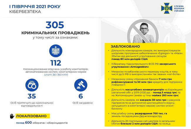 Всего по материалам киберподразделения СБУ в январе-июне было начато 334 уголовных производства. Часть из них касается несанкционированного вмешательства в работу компьютеров и автоматизированных сетей.