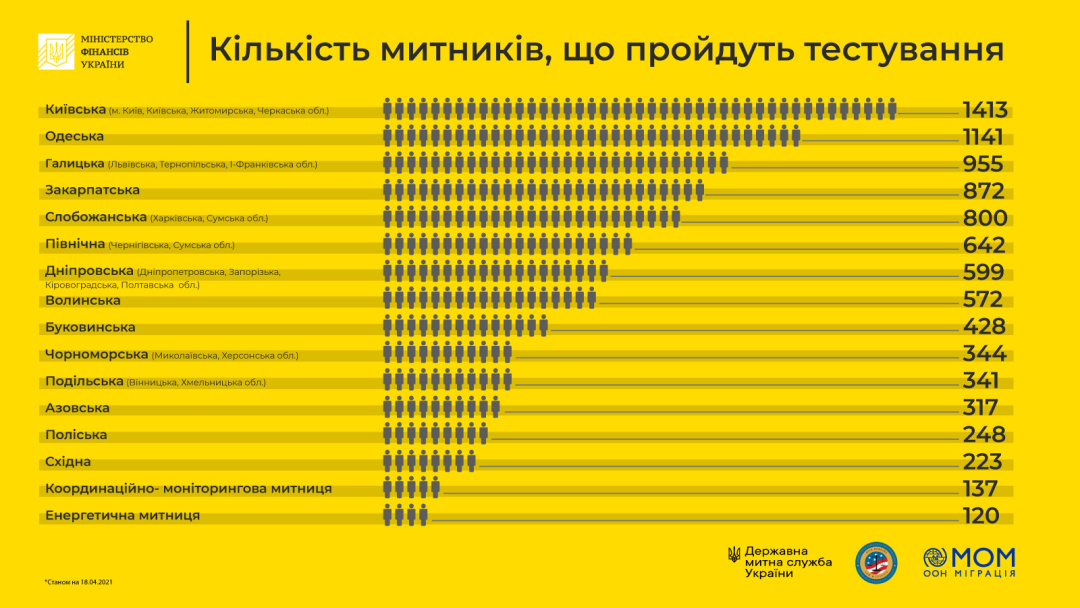 Планируется, что 20 апреля состоится тестирование более 900 таможенников. В первый день наибольшее количество сотрудников будет протестировано на Киевской и Одесской таможнях.