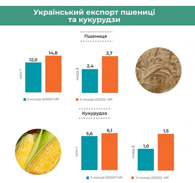 Результаты экспорта за 5 месяца 2021/22 маркетингового года: Пшеница: объем – 14,8 млн т (+23% к прошлому году), экспортная выручка – 3,7 млрд. USD (+56% к прошлому году). Основные страны-импортеры: Индонезия (17% от экспортной выручки), Египет (15%), Турция (8%); Кукуруза: объем – 6,1 млн т (+10% к прошлому году), экспортная выручка – 1,5 млрд USD (+45% к прошлому году). Основные страны-импортеры: Китай (43% от экспортной выручки), Испания (11%), Нидерланды (10%).