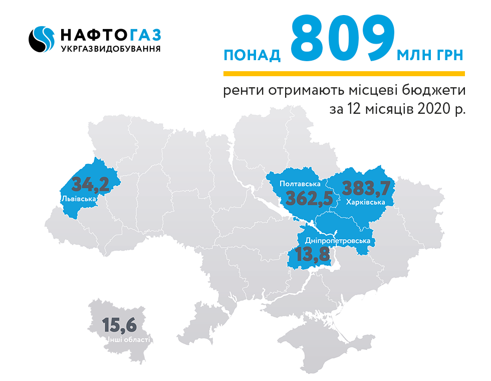 АО " Укргаздобыча ", входящая в группу "Нафтогаз", за январь-декабрь 2020 направило в местные бюджеты, на территории которых компания осуществляет добычу углеводородов, 809,8 млн грн рентных платежей.