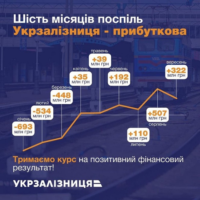 АО "Укрзализныця" уже получает прибыль шестой месяц подряд, в частности за последние три месяца компания получила 939 млн грн.