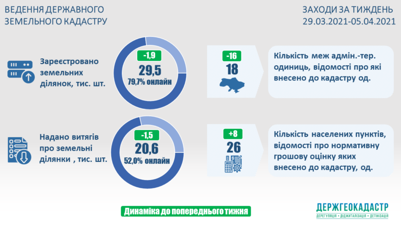 Кроме того, за прошлую неделю регистраторы получили 36,7 тысяч заявлений о регистрации участков, внесли в кадастр 25,9 тысяч участков. Львиная доля заявлений поступила в онлайн-формате от землеустроителей.