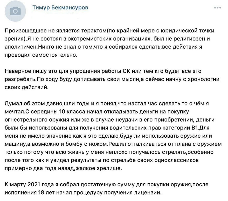 В соцсетях стрелок опубликовал обращение, в котором заявил о предстоящем теракте. По его словам, он «откладывал на оружие еще с 10 класса».