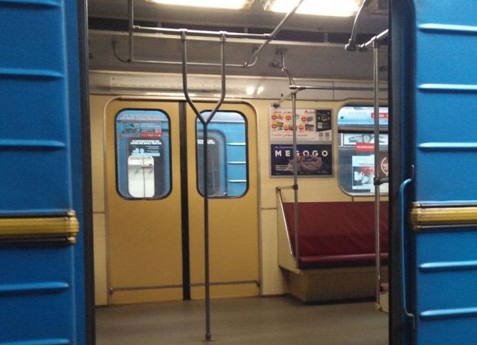 В метро Киева курсирует вагон с вертикальными поручнями.