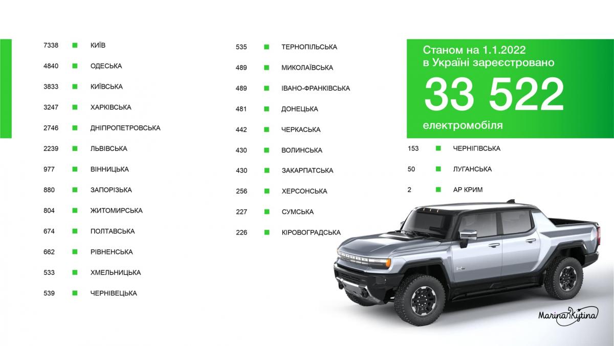 Станом на 1 січня 2022 року в Україні зареєстровано 33 522 електромобілі. Порівняно з попереднім місяцем, що завершився на позначці 32 662 електромобілі, приріст склав 860 одиниць. У статистиці, отриманій з Головного сервісного центру МВС, враховано як нові, так і вживані машини, що ввозяться офіційними імпортерами та приватними особами.